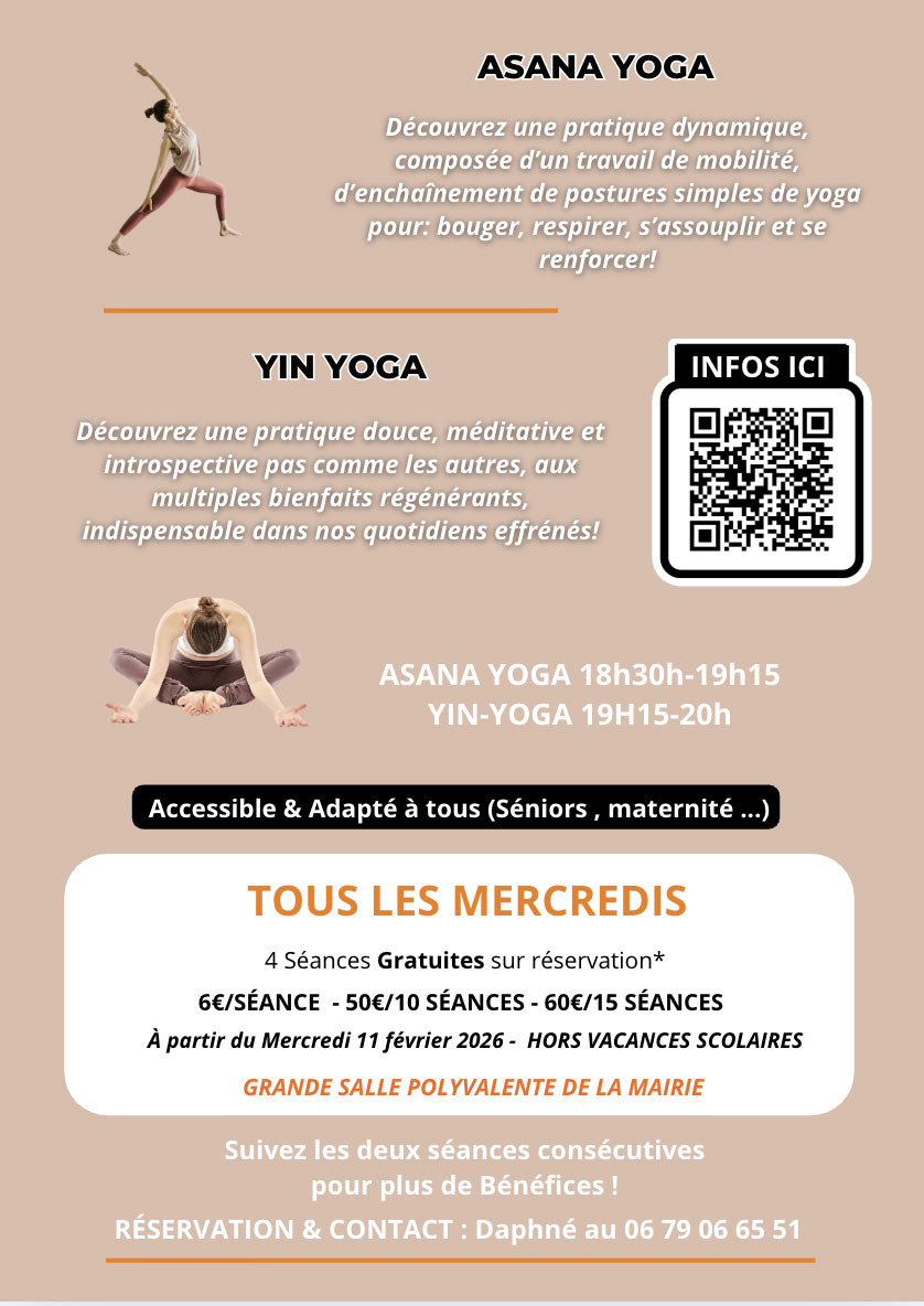 - Asana Yoga (dynamique et accessible) : de 18h30 à 19h15
